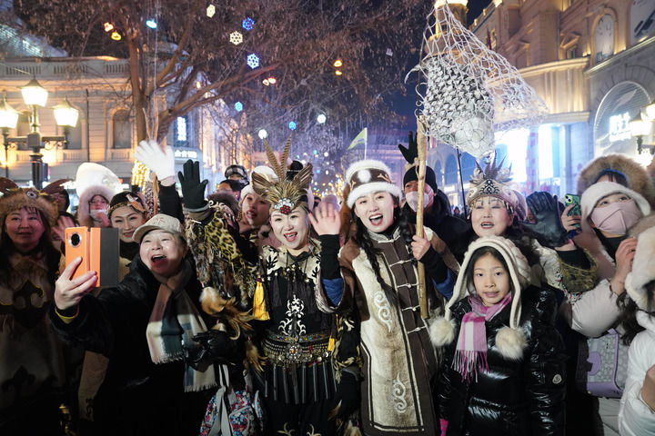 身著赫哲族服飾的赫哲族群眾和饒河縣文旅推薦官在哈爾濱中央大街與游客互動(2024年1月6日攝)。