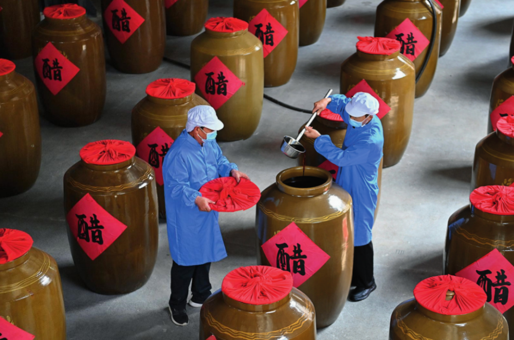 工作人員在山西省長治市平順縣龍溪鎮(zhèn)龍鎮(zhèn)村農旅產(chǎn)業(yè)融合發(fā)展示范園內查看醋的成色(2024年5月10日攝) 楊晨光攝/《瞭望》
