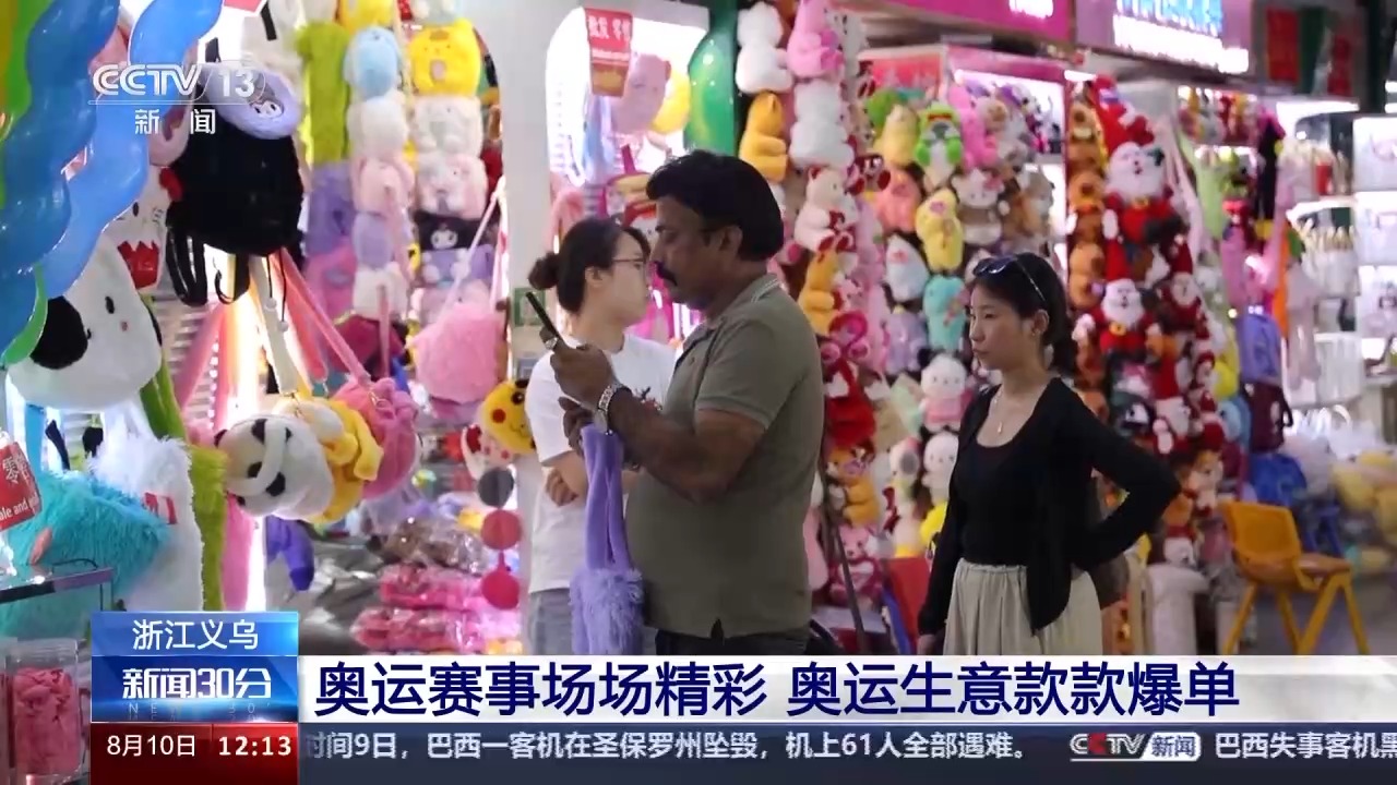 搭乘奧運(yùn)東風(fēng)的不僅是體育健兒的同款配飾,奧運(yùn)周邊產(chǎn)品也備受市場(chǎng)青睞。在義烏國(guó)際商貿(mào)城,這里匯集26個(gè)大類、210多萬(wàn)種商品,不僅滿足了全球觀眾和參賽者的需求,也給義烏商家?guī)砹嗣黠@的經(jīng)濟(jì)效益。