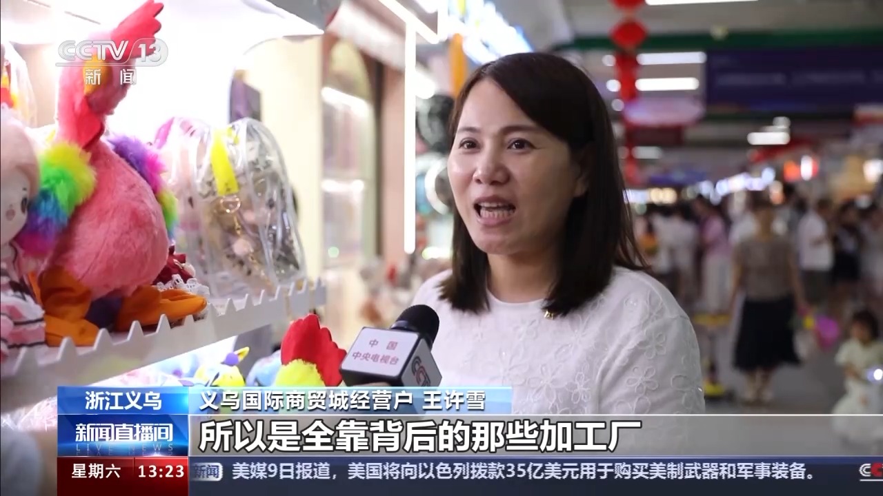 義烏國(guó)際商貿(mào)城經(jīng)營(yíng)戶 王許雪:像我們背后都有100來家工廠給我們供應(yīng),所以是全靠背后的那些加工廠來支持我們,全國(guó)各地的都有。