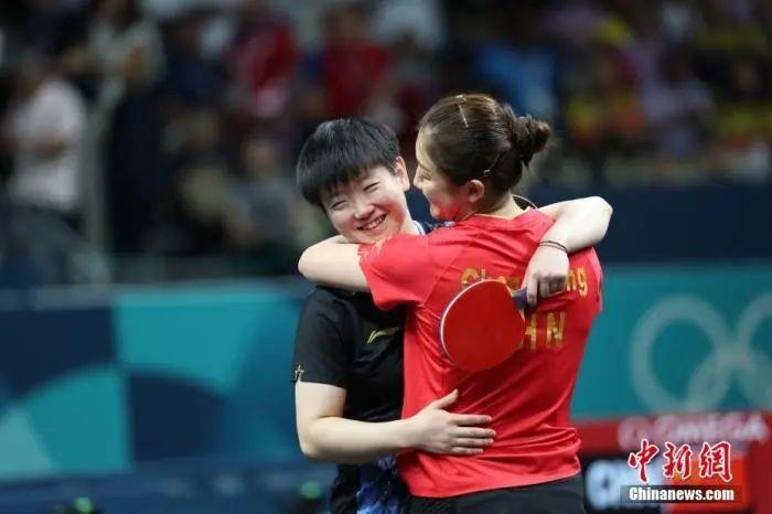 資料圖:巴黎奧運女單決賽后,陳夢擁抱孫穎莎。中新社記者 盛佳鵬 攝