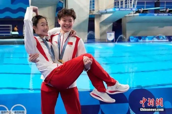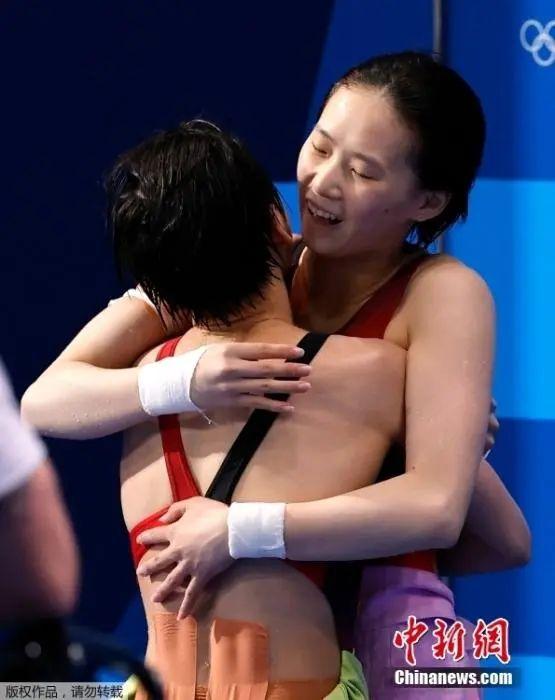 奪冠后的全紅嬋撲進教練陳若琳懷里,隨后又一路小跑奔向陳芋汐。在全世界的矚目下,兩位天才少女緊緊擁抱在一起。