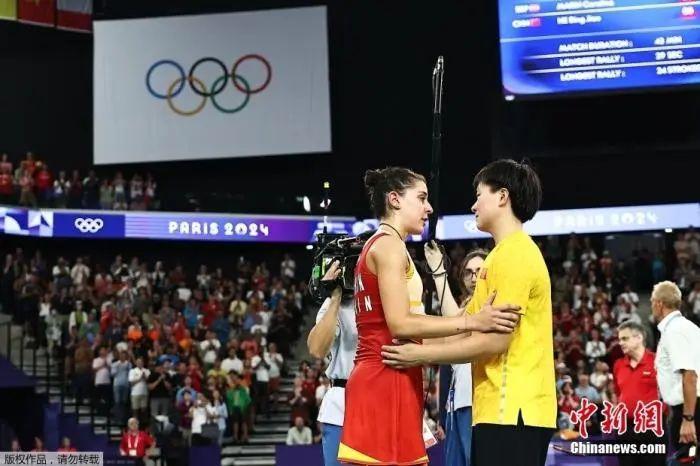 資料圖:當?shù)貢r間8月4日進行的巴黎奧運會羽毛球女單半決賽中,西班牙名將馬林在比賽進行到第二局時因傷棄權,中國選手何冰嬌晉級女單決賽。圖為何冰嬌前去與馬林表示安慰。