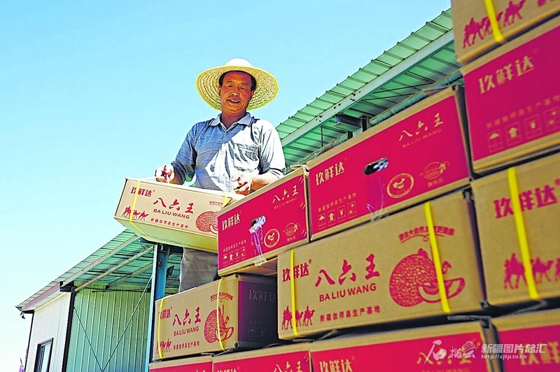 8月5日,位于伽師縣臥里托格拉克鎮(zhèn)的新疆果品(伽師)批發(fā)交易市場(chǎng),工人在裝運(yùn)伽師瓜,準(zhǔn)備運(yùn)往疆外。便捷的交通,讓當(dāng)?shù)剞r(nóng)產(chǎn)品快速發(fā)往全國(guó)。 石榴云/新疆日?qǐng)?bào)記者何新社攝