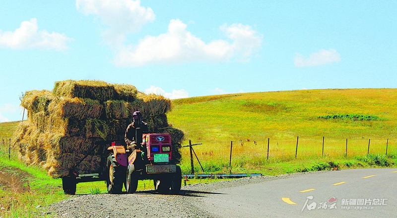 8月8日,位于裕民縣巴爾魯克山區(qū)的阿克喬克草原,牧民駕駛拖拉機(jī)拉運(yùn)草料。近年來(lái),該縣通過(guò)對(duì)農(nóng)村公路升級(jí)改造,優(yōu)化了城鄉(xiāng)公路網(wǎng),為農(nóng)牧民出行、農(nóng)作物運(yùn)輸提供更多便利條件。 楊化光攝