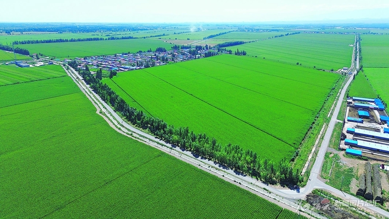 俯瞰博樂(lè)市小營(yíng)盤鎮(zhèn)呼和布熱村一角(8月8日無(wú)人機(jī)攝)。放眼該村,平坦的農(nóng)村公路、綠色的條田、整齊的村莊,形成一幅美麗的鄉(xiāng)村畫(huà)卷。 賀程攝