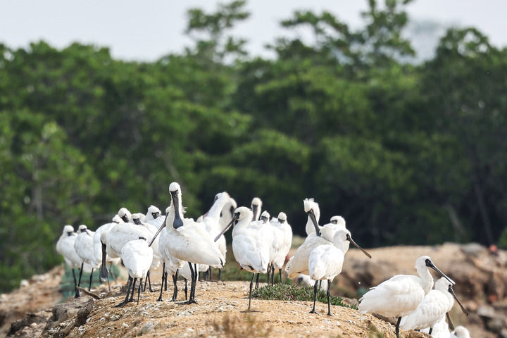 一群黑臉琵鷺在海南新盈紅樹林國(guó)家濕地公園休憩(2023年12月27日攝)。