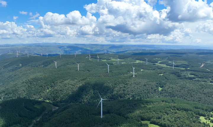 這是河北省圍場(chǎng)滿族蒙古族自治縣御道口鎮(zhèn)附近的風(fēng)電場(chǎng)(2024年7月26日攝,無人機(jī)照片)。