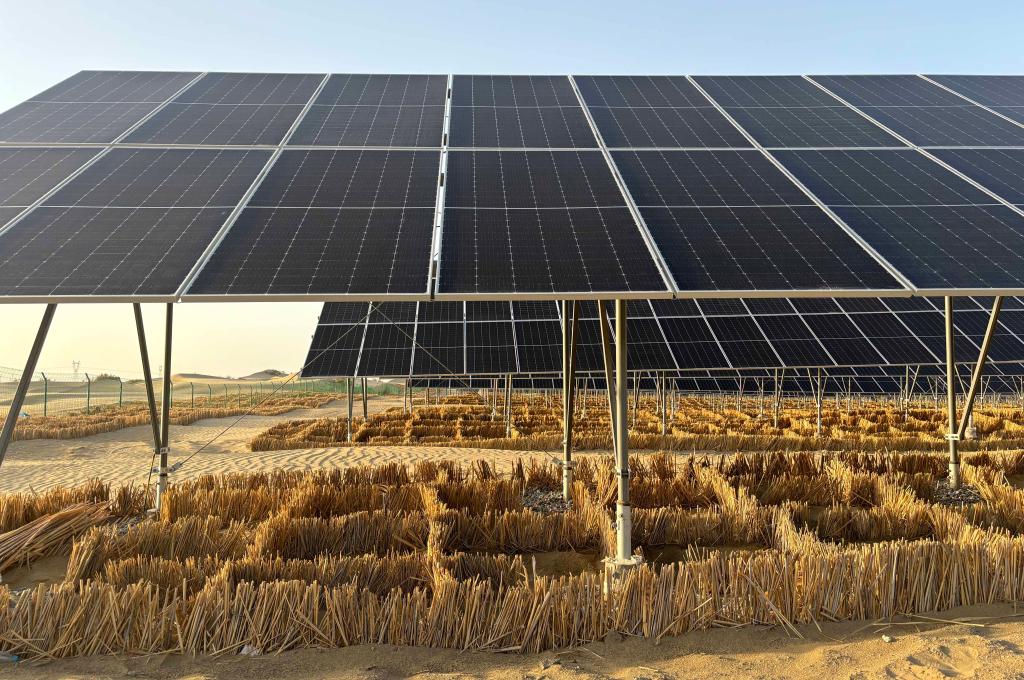 從新疆庫爾勒市出發(fā),沿著烏若高速向東南方向駛入“死亡之?!薄死敻缮衬沟?,寫著“沙戈荒光伏生態(tài)治沙示范項目”大字的一座光伏電站映入眼簾。光伏板下及光伏電站外圍,青黃色的蘆葦稈扎入沙中構成“圍棋盤”式的草方格,將黃沙牢牢包圍。