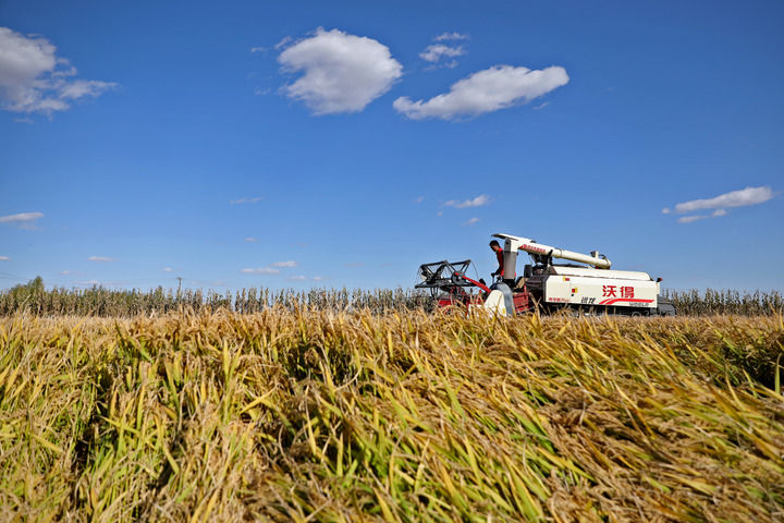 農(nóng)業(yè)機(jī)械在遼寧盤(pán)錦市遼河三角洲尤巧元家庭農(nóng)場(chǎng)的稻田里收割水稻(2023年10月20日攝)。新華社記者 姚劍鋒 攝