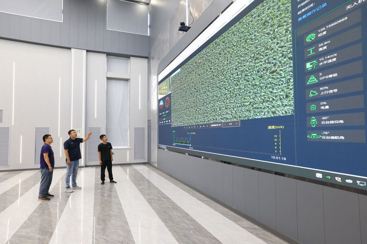 在黑龍江北大荒集團(tuán)趙光農(nóng)場(chǎng)有限公司科技服務(wù)中心,農(nóng)業(yè)科技人員通過(guò)田間物聯(lián)網(wǎng)系統(tǒng)在數(shù)字農(nóng)業(yè)指揮大廳實(shí)時(shí)觀看智能無(wú)人機(jī)回傳的視頻,及時(shí)查看田間作物長(zhǎng)勢(shì)情況(2024年7月22日攝)。新華社發(fā)(錢泊羽攝)