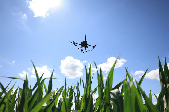 在黑龍江北大荒集團(tuán)趙光農(nóng)場(chǎng)有限公司農(nóng)業(yè)科技園區(qū),一臺(tái)智能無(wú)人機(jī)按照規(guī)定時(shí)間、規(guī)定路線進(jìn)行自動(dòng)巡田作業(yè)(2024年7月22日攝)。新華社發(fā)(錢泊羽攝)