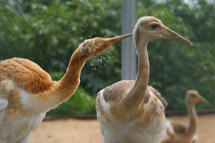 丹頂鶴雛鳥(niǎo)在遼寧盤(pán)錦市林業(yè)和濕地保護(hù)服務(wù)中心鶴類繁育保護(hù)站內(nèi)嬉戲(2023年8月3日攝)。新華社記者 陳為 攝