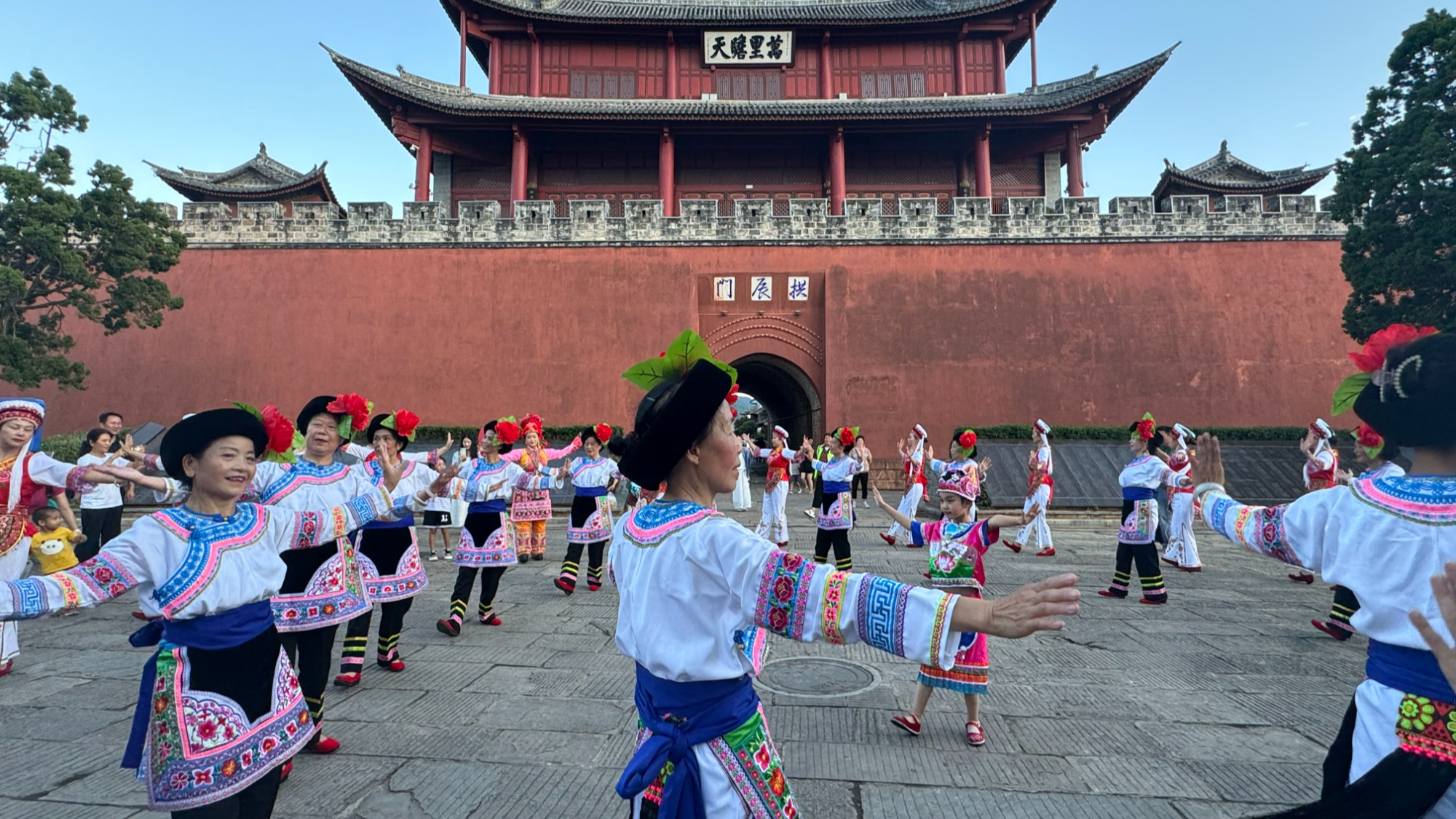 在巍山古城拱辰樓廣場,經(jīng)常有“法治匯演”在這里上演。昨天,巍山的幾只民族文藝隊(duì)表演了《白族霸王鞭》舞蹈、《平安巍山》快板、《是你》聲樂、《阿克哩哈》舞蹈等節(jié)目,巧妙地將普法內(nèi)容融入到其中,以歌舞傳遞法治的力量,群眾載歌載舞,現(xiàn)場氛圍濃烈。