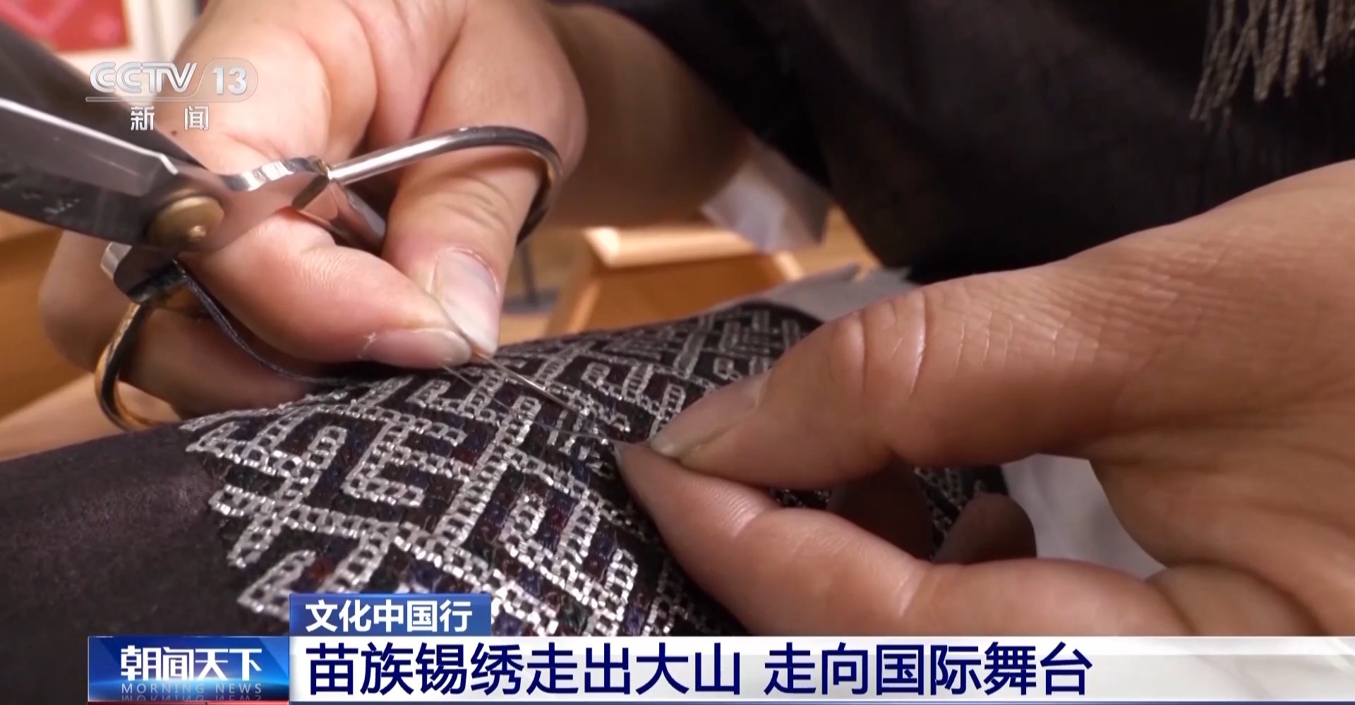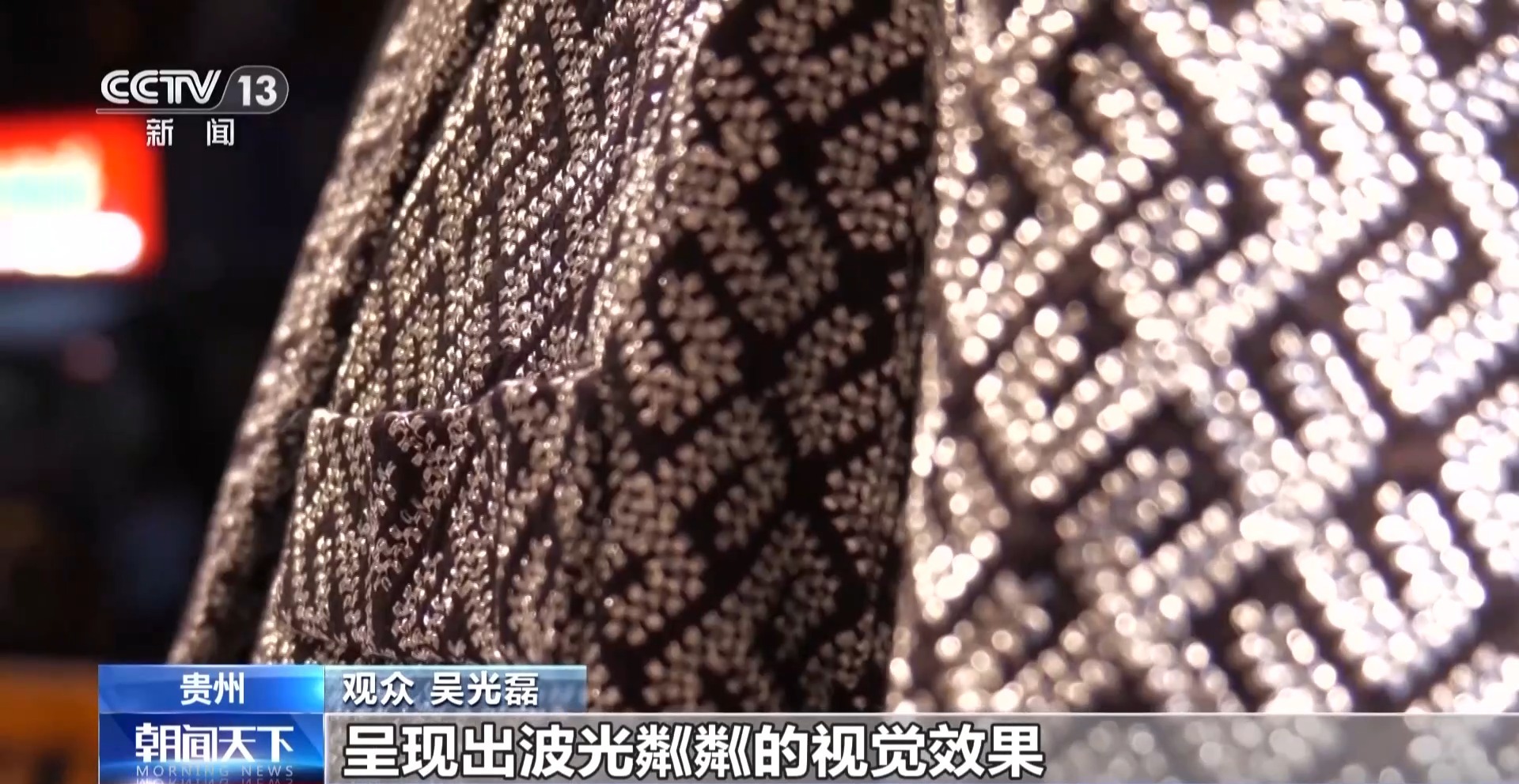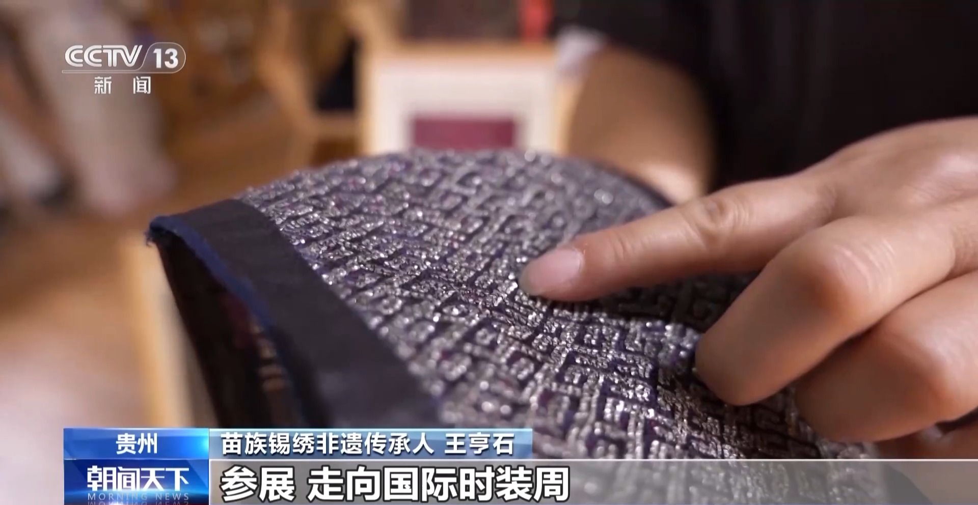 苗族錫繡非遺傳承人 王亨石:按照他要尺寸的大小自己繡出來,繡出來以后寄給他,他自己再設計出作品,參展,走向國際時裝周。我想生在大山里面幾百年的錫繡,今天能走上這么高的國際舞臺,我真的感到很高興而且很自豪。