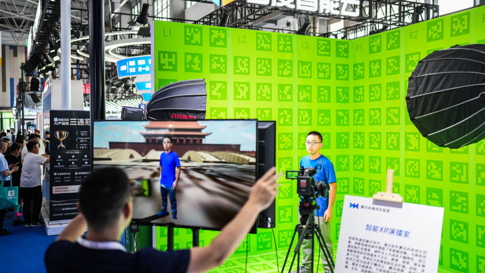 ↑8月28日,參觀者在數博會展館內體驗智能XR演播室。