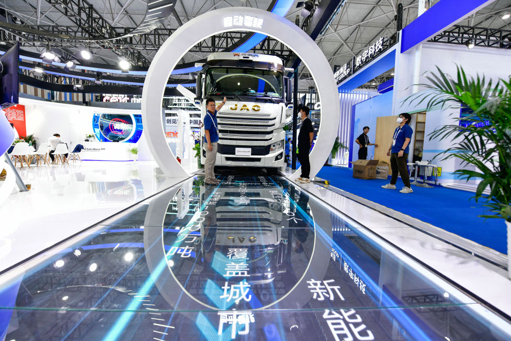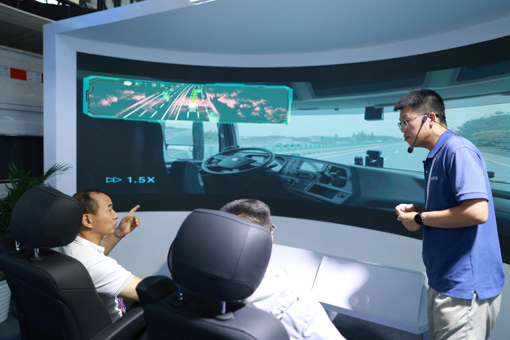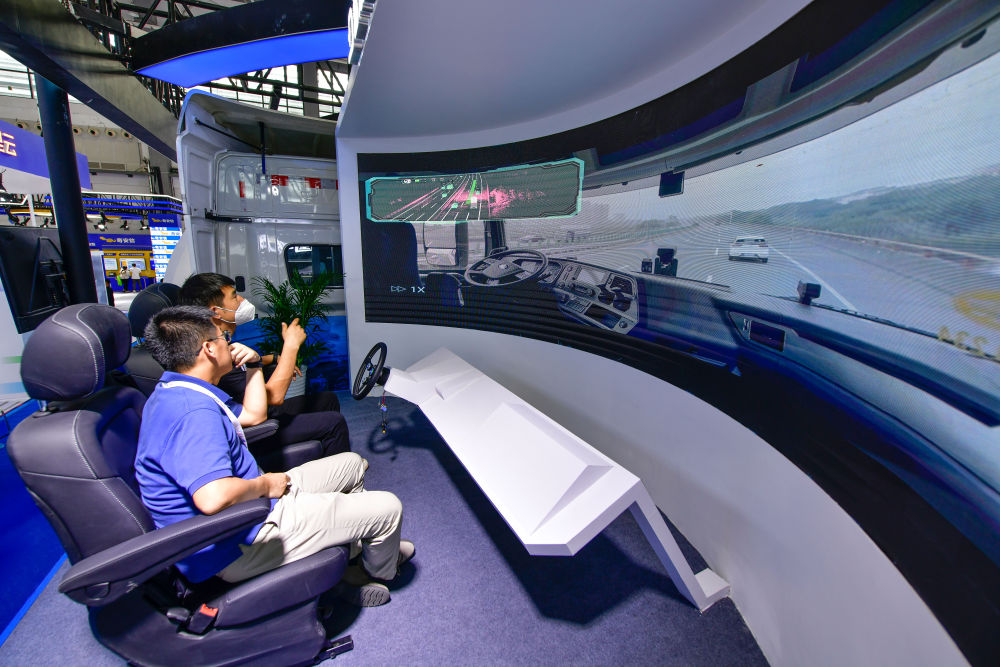 8月28日,工作人員在數博會上播放無人駕駛重型卡車上路行駛視頻。