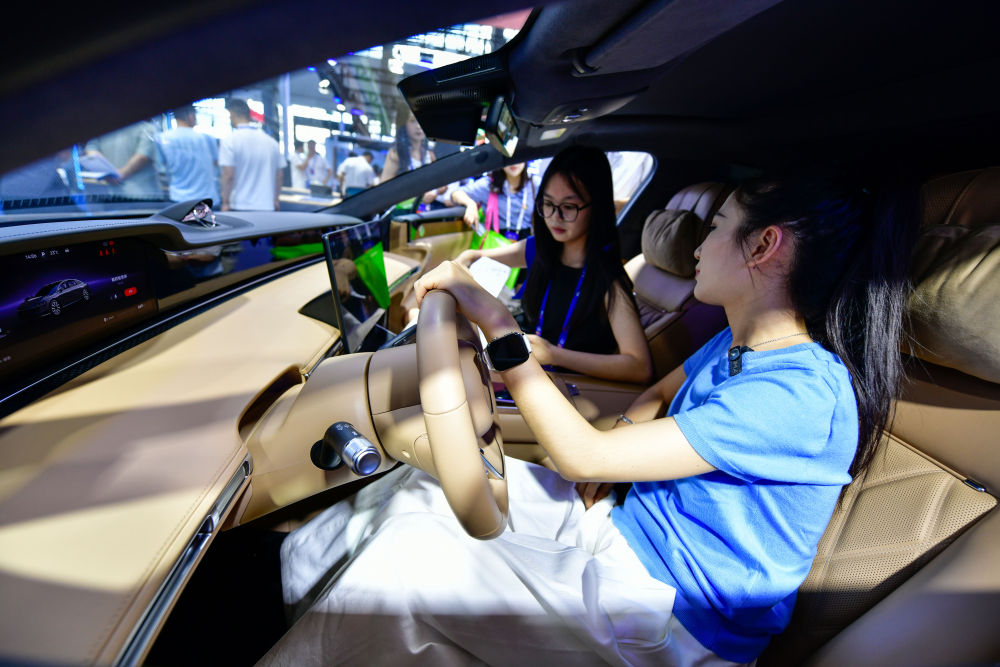 8月28日,參會人員在數博會上體驗新能源智能駕駛汽車。