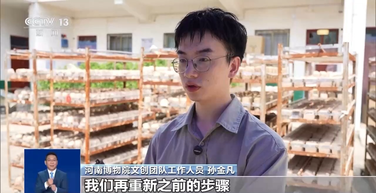 河南博物院文創(chuàng)團(tuán)隊(duì)工作人員 孫金凡:和泥巴、調(diào)配方、做試驗(yàn),每天都是灰頭土臉的,就是還原文物在考古工作者出土?xí)r的那一瞬間。同學(xué)就會問,還在村里面呢?我說對,還在那和泥巴。