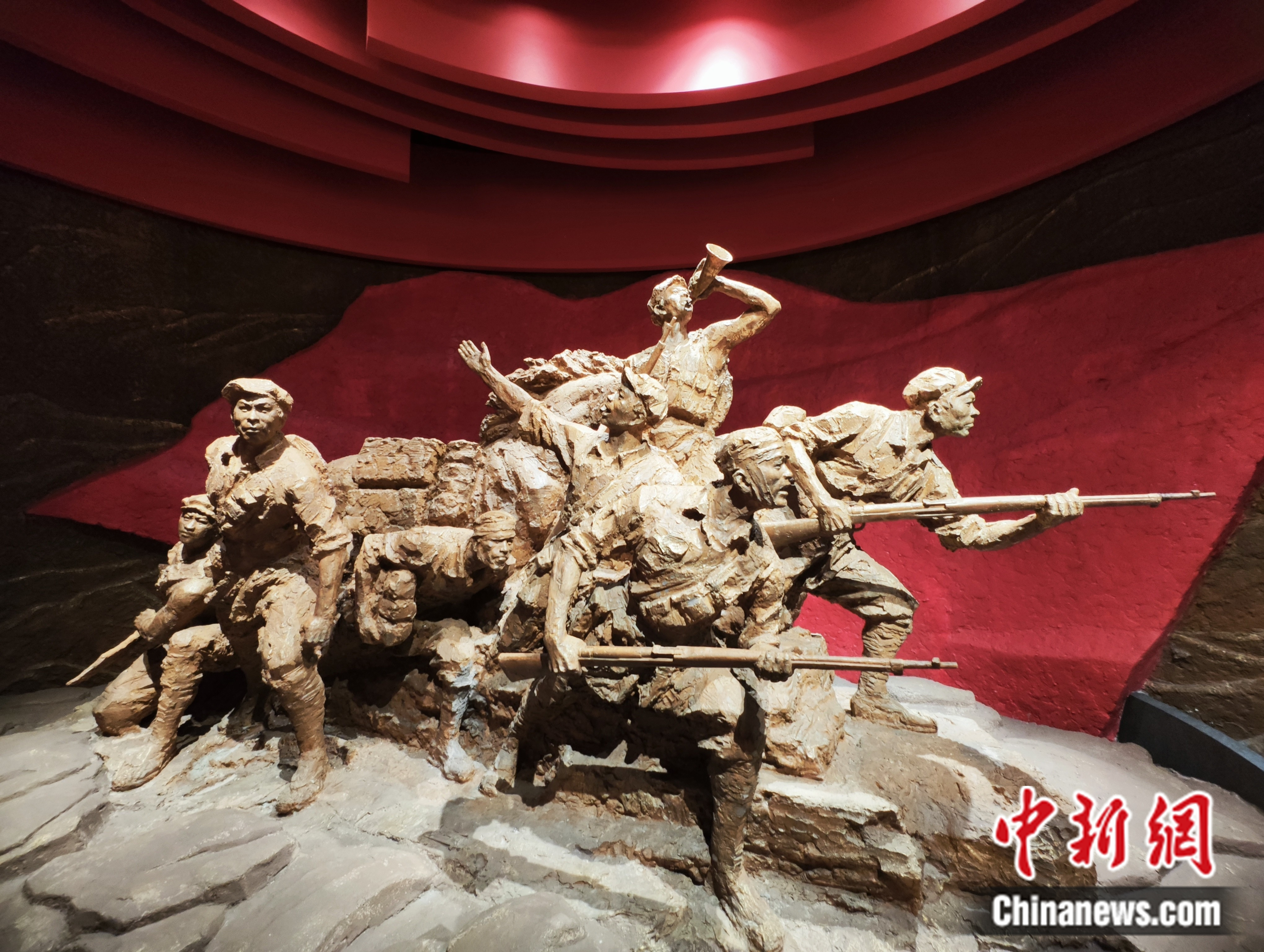展館正門外,“風(fēng)展紅旗如畫”的雕塑兩側(cè),十座紅軍司號員雕像映入眼簾,它們高數(shù)米,持小號,形態(tài)各異,繪出一幅如火如荼的革命畫卷。