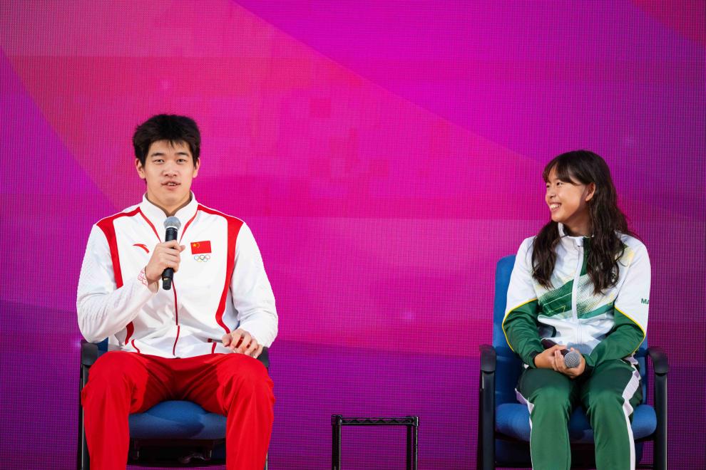 9月1日,游泳運(yùn)動(dòng)員潘展樂(左)在活動(dòng)中回答澳門運(yùn)動(dòng)員的提問。新華社記者 張金加 攝