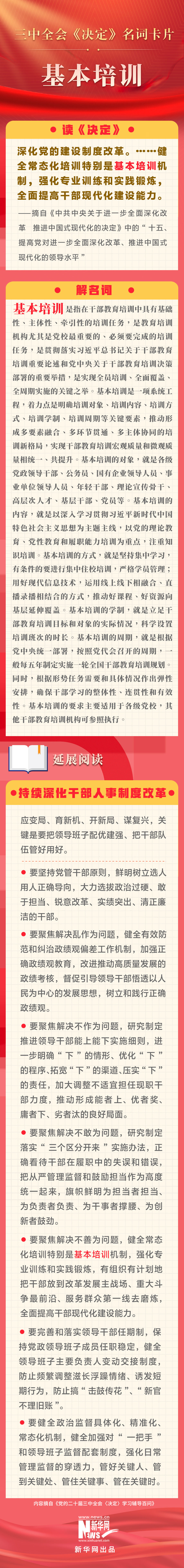 黨的二十屆三中全會(huì)審議通過了《中共中央關(guān)于進(jìn)一步全面深化改革、推進(jìn)中國(guó)式現(xiàn)代化的決定》。新華網(wǎng)依據(jù)《黨的二十屆三中全會(huì)〈決定〉學(xué)習(xí)輔導(dǎo)百問》,制作三中全會(huì)《決定》系列名詞卡片,和大家一起來深入學(xué)習(xí)領(lǐng)會(huì)二十屆三中全會(huì)精神。本期名詞是“基本培訓(xùn)”。
