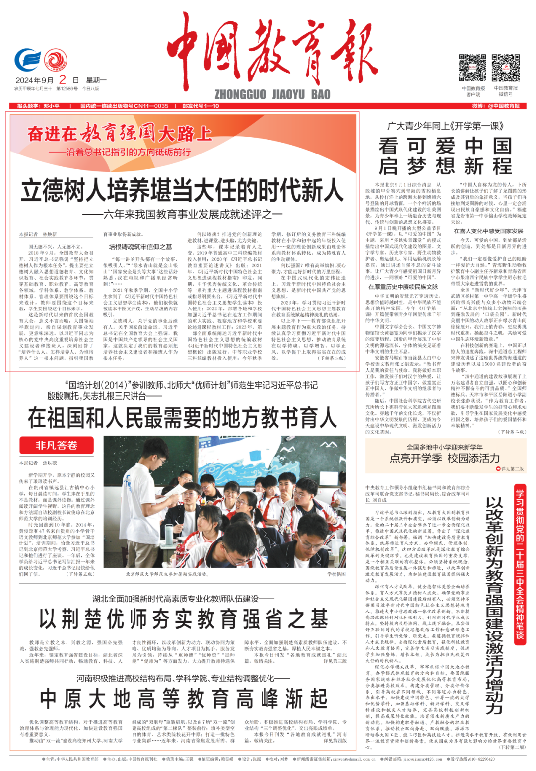 今年7月15日至18日,黨的二十屆三中全會召開,緊緊圍繞推進中國式現(xiàn)代化、落實黨的二十大戰(zhàn)略部署來謀劃進一步全面深化改革。全會審議通過的《中共中央關于進一步全面深化改革、推進中國式現(xiàn)代化的決定》,明確“教育、科技、人才是中國式現(xiàn)代化的基礎性、戰(zhàn)略性支撐”,并強調“完善立德樹人機制”“健全德智體美勞全面培養(yǎng)體系”,這彰顯著教育事業(yè)“為黨育人、為國育才”一以貫之的初心,更傳達了明確信號——深化教育綜合改革培養(yǎng)時代新人的動力將伴隨教育強國建設愈發(fā)強勁。