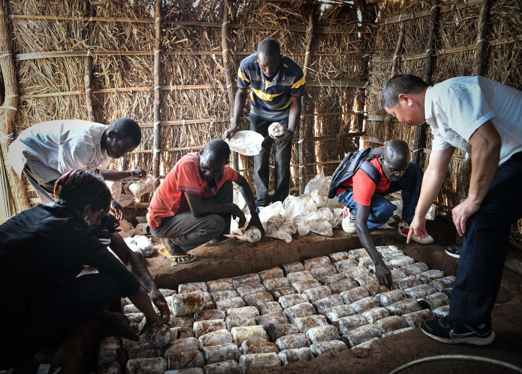 8月13日,在盧旺達南方省胡耶區(qū)的中國援盧農業(yè)技術示范中心,菌草專家陳曉斌(右二)與當?shù)剞r民一起制作菌種培養(yǎng)料。