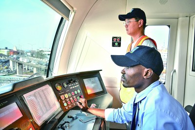 尼日利亞拉各斯,中國師傅指導當地見習司機駕駛中企承建的輕軌列車。新華社發(fā)
