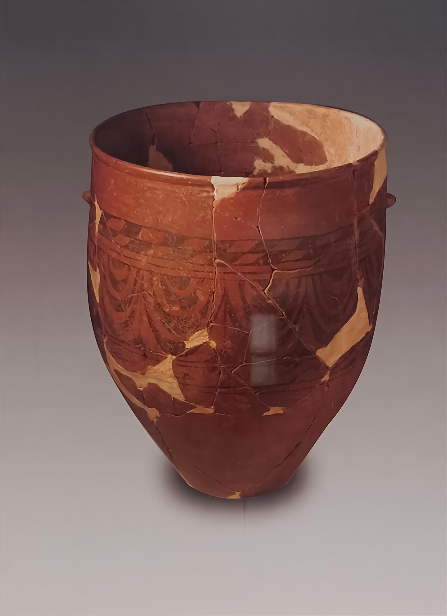 這件彩繪平底筒形罐最上面的菱形方格紋來自中亞地區(qū),其下一片片的龍鱗紋是赤峰地區(qū)的本土元素,下方勾連狀的抽象玫瑰花圖案,則是仰韶文化的元素,體現(xiàn)了5500年前三種文化在草原深處碰撞出的文明火花。