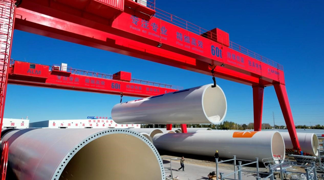蒙東(通遼)風電裝備制造產(chǎn)業(yè)基地內(nèi),一排排風葉和塔筒即將運往全國各地。林林攝