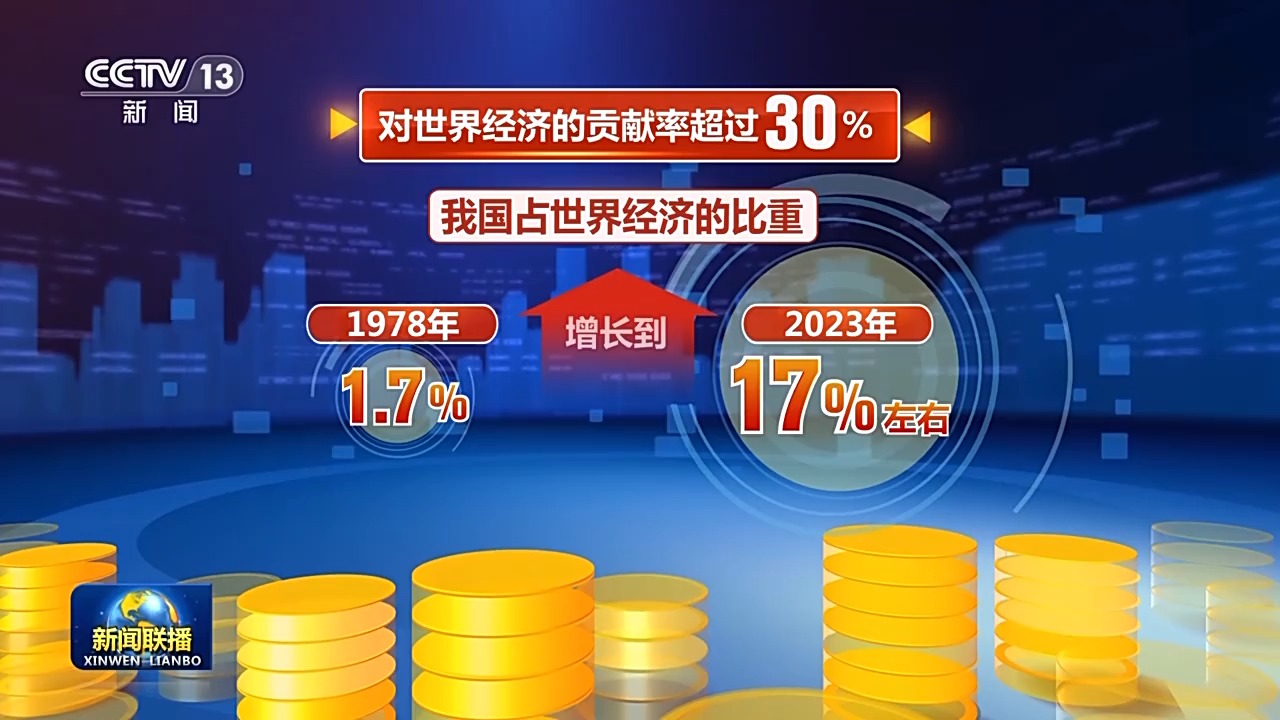 我國占世界經濟的比重,從有數(shù)據(jù)統(tǒng)計以來的1978年的1.7%,增長到2023年的17%左右,對世界經濟的貢獻率超過30%。