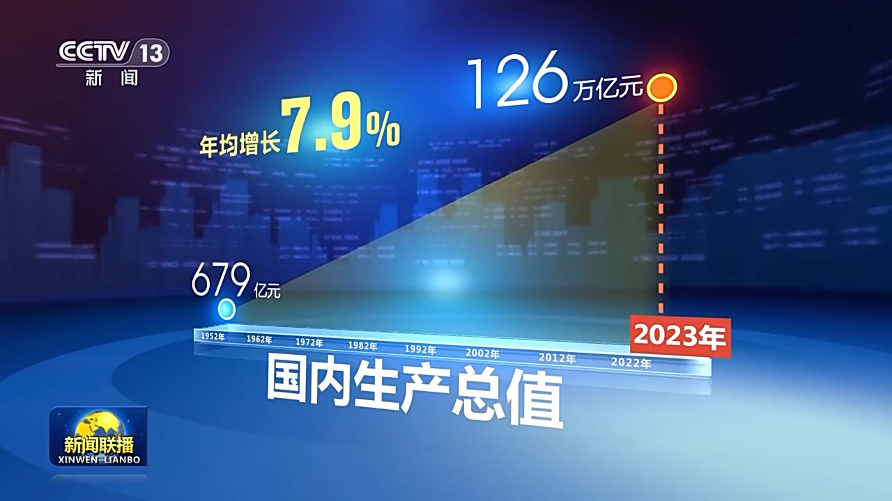 我國國內生產總值,從有數(shù)據(jù)統(tǒng)計以來的1952年的679億元,增長到2023年的126萬億元,年均增長7.9%。