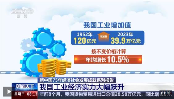 國家統(tǒng)計局昨天(10日)發(fā)布的新中國75年經(jīng)濟社會發(fā)展成就系列報告顯示,新中國成立75年以來,我國工業(yè)經(jīng)濟實現(xiàn)了規(guī)模總量的跨越式增長和發(fā)展質(zhì)量的顯著提升,由農(nóng)業(yè)國成長為世界第一制造業(yè)大國。