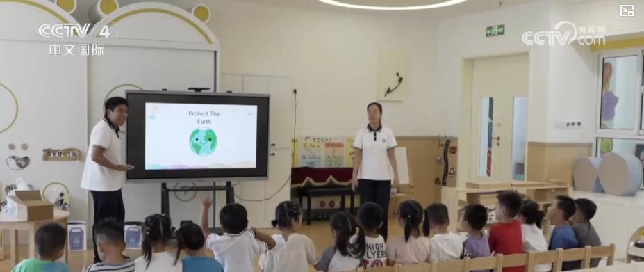在雄安白塔幼兒園里,美國(guó)外教佩雷斯正在教孩子們?nèi)绾芜M(jìn)行垃圾分類(lèi)。