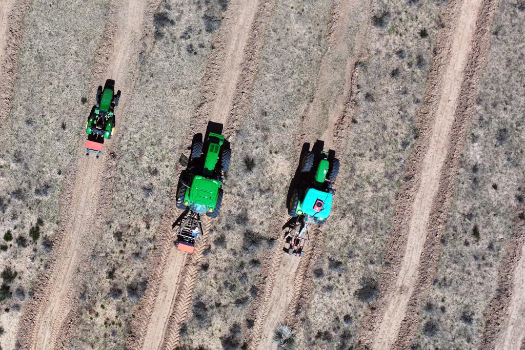 6月15日,在地處黃河“幾字彎”的內(nèi)蒙古庫(kù)布其沙漠防沙治沙項(xiàng)目區(qū),工人駕駛牽引播種機(jī)種檸條(無(wú)人機(jī)拍攝)。新華社記者 李云平 攝