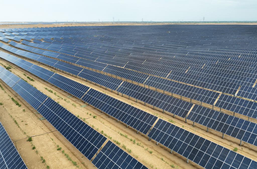 這是7月5日拍攝的內(nèi)蒙古烏蘭布和沙漠防沙治沙和風(fēng)電光伏一體化項(xiàng)目區(qū)(無(wú)人機(jī)拍攝)。新華社記者 李云平 攝