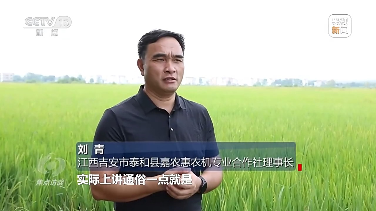 江西吉安市泰和縣嘉農(nóng)惠農(nóng)機(jī)專業(yè)合作社理事長(zhǎng) 劉青:實(shí)際上我們就是農(nóng)民的“田間保姆”,農(nóng)民雇傭我們,我們做他的保姆,為他田里面的稻子種植整個(gè)過程,做一個(gè)保姆式服務(wù)。