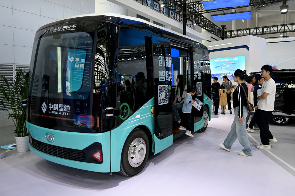 9月21日,在2024世界制造業(yè)大會上,人們參觀體驗一款無人駕駛觀光巴士。新華社記者 黃博涵 攝