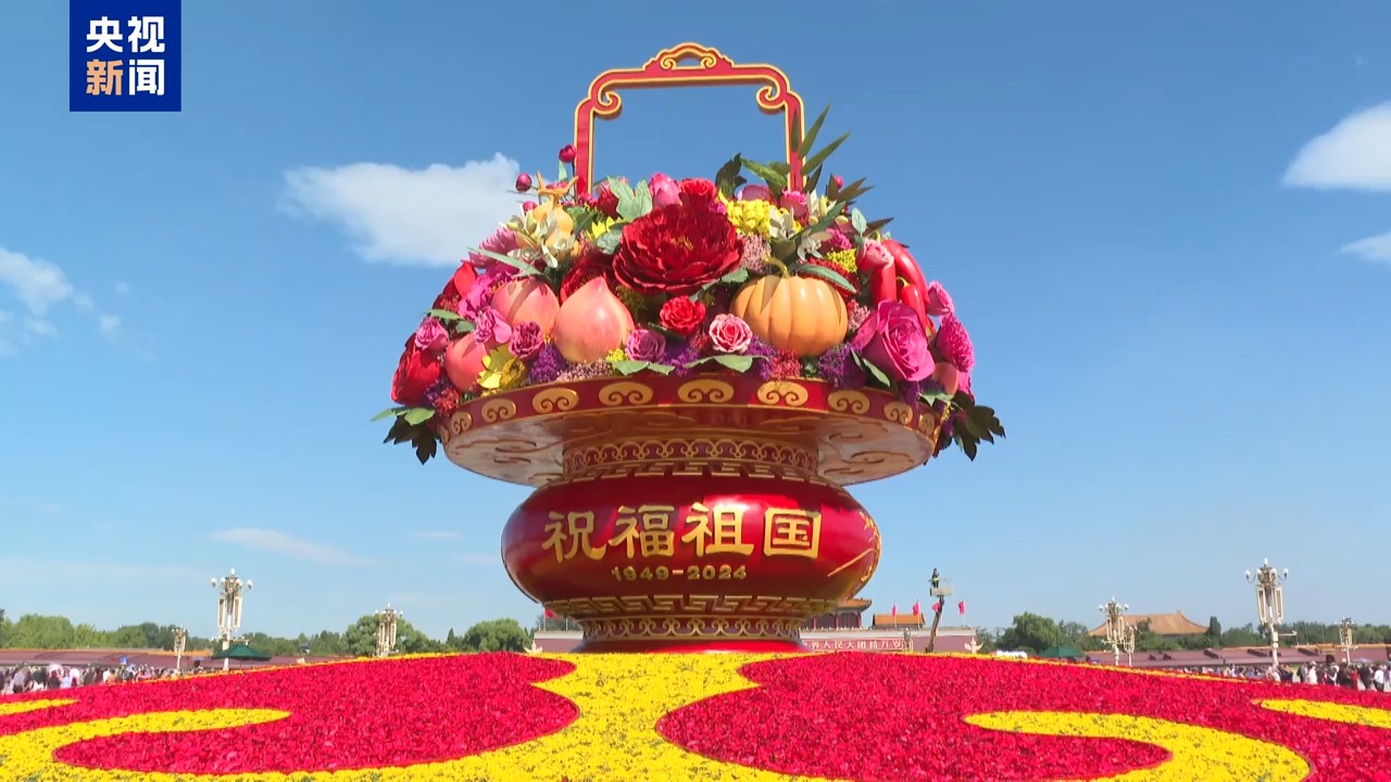 今天,北京秋高氣爽,陽光明媚。天安門廣場上游人如織,廣場中央布置一新的巨型大花籃精彩亮相,格外耀眼,吸引了眾多游客圍觀拍照。