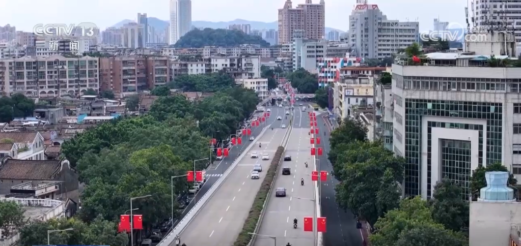 在廣東深圳,公園、廣場(chǎng)、街道上,處處可以看到五星紅旗迎風(fēng)飄揚(yáng)。紅旗與藍(lán)天、綠樹、高樓交相輝映,為城市增添了濃濃的節(jié)日氛圍。