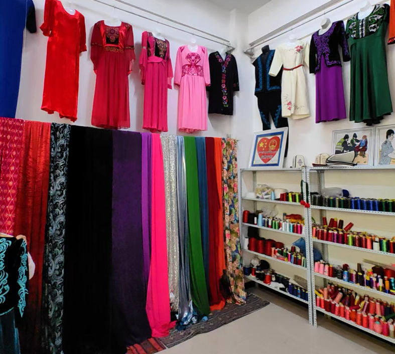 托云牧場(chǎng)積極鞏固政策支持,集中力量打造項(xiàng)目驅(qū)動(dòng),有效推進(jìn)地方產(chǎn)業(yè)集群的全面發(fā)展,實(shí)現(xiàn)經(jīng)營(yíng)集約化與產(chǎn)業(yè)高效整合。2015年,由牧場(chǎng)“刺繡巧匠”吐孔·沙熱牽頭并成功注冊(cè)了“托云牧場(chǎng)帕米爾刺繡”合作社。到了2019年,牧場(chǎng)成功申請(qǐng)到160萬(wàn)元援疆資金,用于建設(shè)新的手工刺繡產(chǎn)品生產(chǎn)基地。在吐孔·沙熱的帶動(dòng)下,合作社目前擁有60名成員,其中43名技藝嫻熟的繡工,年總收入攀升至三十萬(wàn)。該合作社通過直銷、與克州百來思服裝店的業(yè)務(wù)合作,以及接受附近學(xué)校的校服訂單等多種渠道,將其生產(chǎn)的床品、家居布藝、女性服裝及校服推向阿圖什市、烏恰縣等地區(qū)市場(chǎng)。