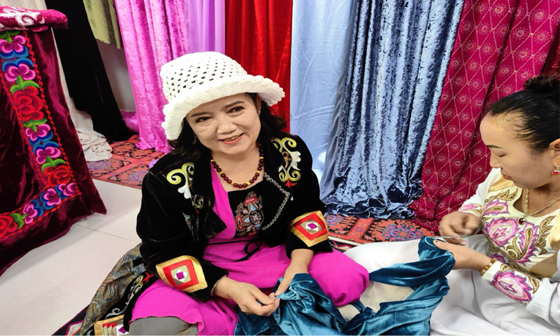 將傳統(tǒng)手工藝轉(zhuǎn)化為商品,市場(chǎng)化推進(jìn),托云牧場(chǎng)不懈探索手工藝與鄉(xiāng)村振興的新路徑,助力當(dāng)?shù)厥止に嚾藢ⅰ爸讣饧妓嚒鞭D(zhuǎn)化為“指尖經(jīng)濟(jì)”。維吾爾族姑娘努力曼古麗·買加買提分享道:“在刺繡合作社,我與柯爾克孜族的姐妹互相切磋學(xué)習(xí),通過刺繡工藝的差異,我們發(fā)現(xiàn)了各民族刺繡的獨(dú)特風(fēng)格,同時(shí)發(fā)現(xiàn)很多共通的地方。在彼此互相了解學(xué)習(xí)的過程中,感受到了各民族文化的相互交融與共同進(jìn)步。”