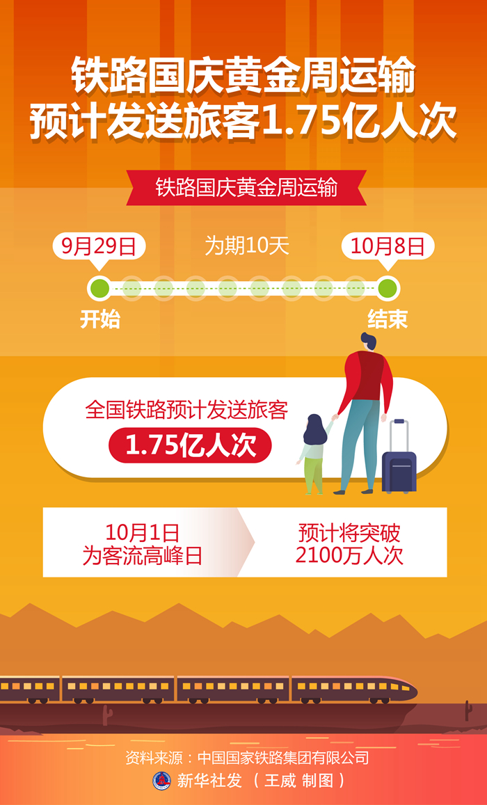 記者從中國國家鐵路集團(tuán)有限公司獲悉,鐵路國慶黃金周運(yùn)輸自9月29日開始,至10月8日結(jié)束,為期10天,全國鐵路預(yù)計(jì)發(fā)送旅客1.75億人次,10月1日為客流高峰日,預(yù)計(jì)將突破2100萬人次。