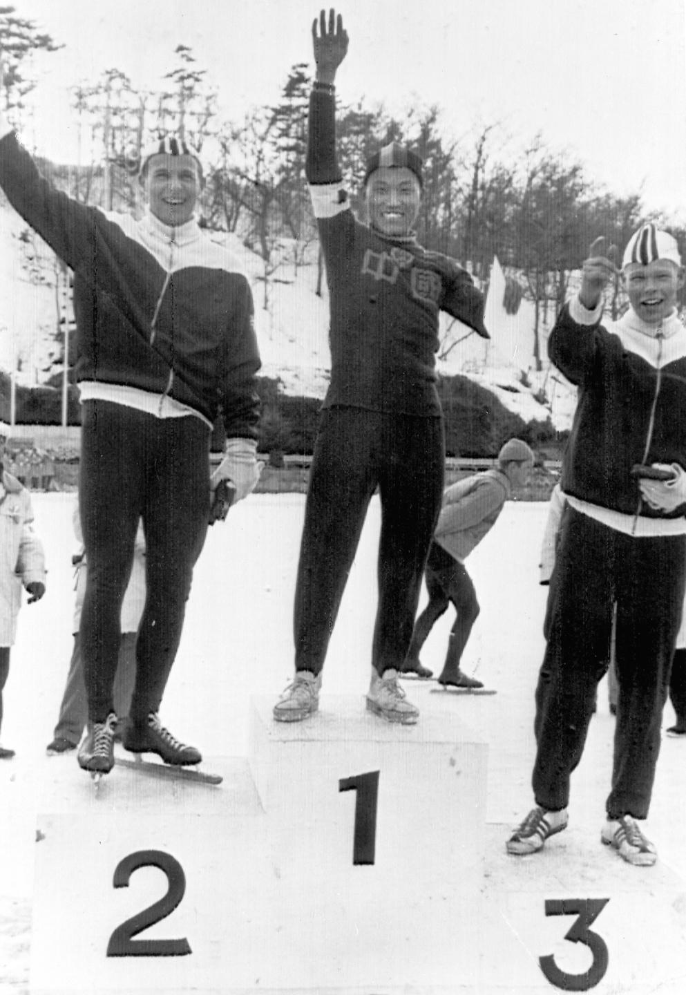 1963年2月24日,在日本舉行的世界速度滑冰錦標賽中,羅致煥獲得男子1500米項目冠軍。這是中國運動員第一次取得冰雪項目的單項世界冠軍。圖為羅致煥(中)受獎后向觀眾致意。 新華社發(fā)(資料照片)