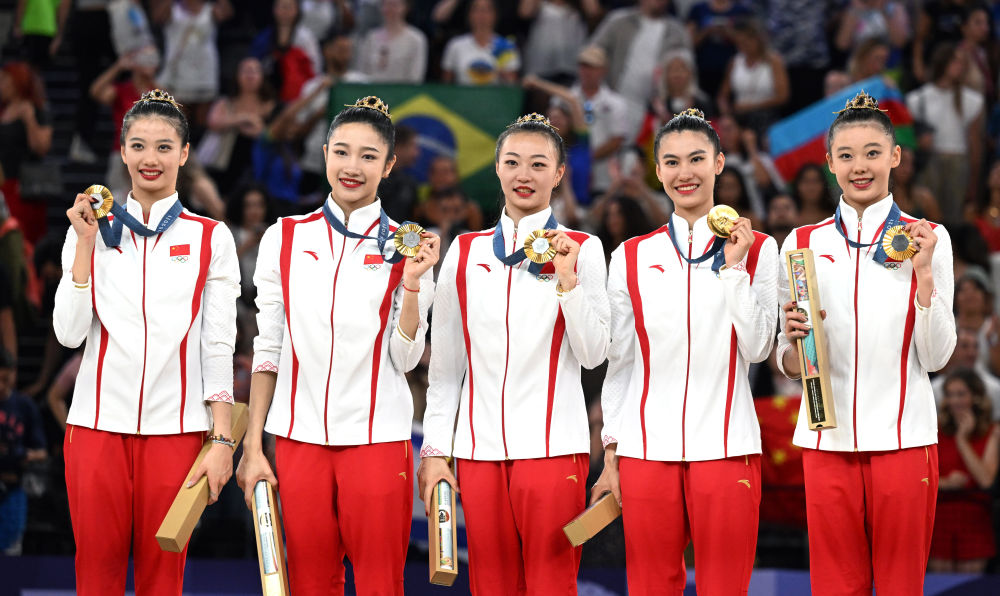 8月10日,中國隊在頒獎儀式上。當日,在巴黎奧運會藝術(shù)體操項目集體全能決賽中,中國隊獲得冠軍。新華社記者 程敏 攝
