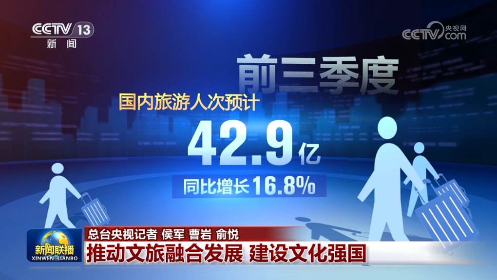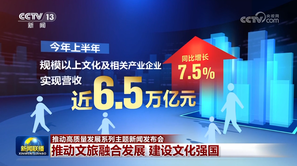 今年上半年,規(guī)模以上文化及相關(guān)產(chǎn)業(yè)企業(yè)實(shí)現(xiàn)營收近6.5萬億元,同比增長7.5%;前三季度,國內(nèi)旅游人次預(yù)計(jì)達(dá)42.9億,同比增長16.8%;入境旅游人次預(yù)計(jì)達(dá)0.95億,同比增長55.4%,更多外國民眾來華旅游,體驗(yàn)賓至如歸、感受美好中國。
