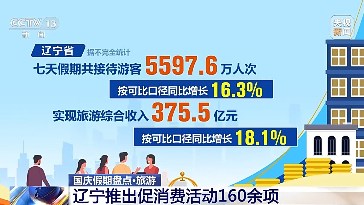 遼寧省據(jù)不完全統(tǒng)計(jì),七天假期共接待游客5597.6萬(wàn)人次,按可比口徑同比增長(zhǎng)16.3%,實(shí)現(xiàn)旅游綜合收入375.5億元,按可比口徑同比增長(zhǎng)18.1%。假期里遼寧省推出促消費(fèi)活動(dòng)160余項(xiàng),全省各地舉辦文化藝術(shù)、群眾文化、非遺、文博等各類(lèi)活動(dòng)600余場(chǎng),通過(guò)線(xiàn)上線(xiàn)下聯(lián)動(dòng)的方式,豐富人們假日文化生活。
