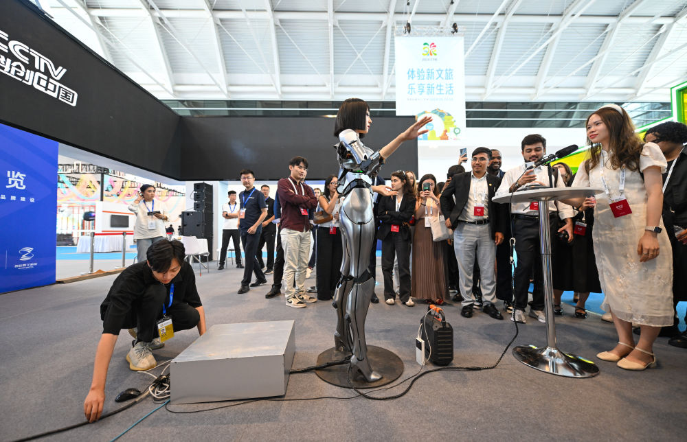 會(huì)展搭建師在天津舉辦的中國文化旅游產(chǎn)業(yè)博覽會(huì)現(xiàn)場維護(hù)AI機(jī)器人互動(dòng)設(shè)備(9月13日攝)。新華社記者 孫凡越 攝