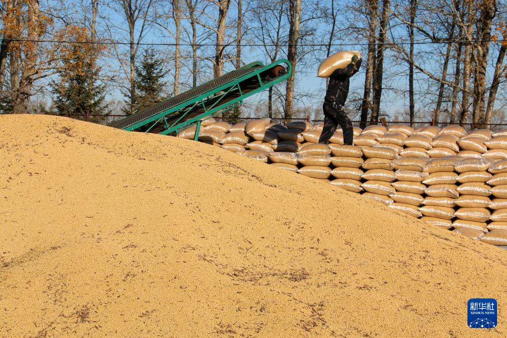 10月3日,在北大荒集團(tuán)黑龍江五大連池農(nóng)場(chǎng)有限公司第一作業(yè)區(qū)糧食晾曬場(chǎng),種植戶在堆放大豆。新華社發(fā)(陸文祥攝)